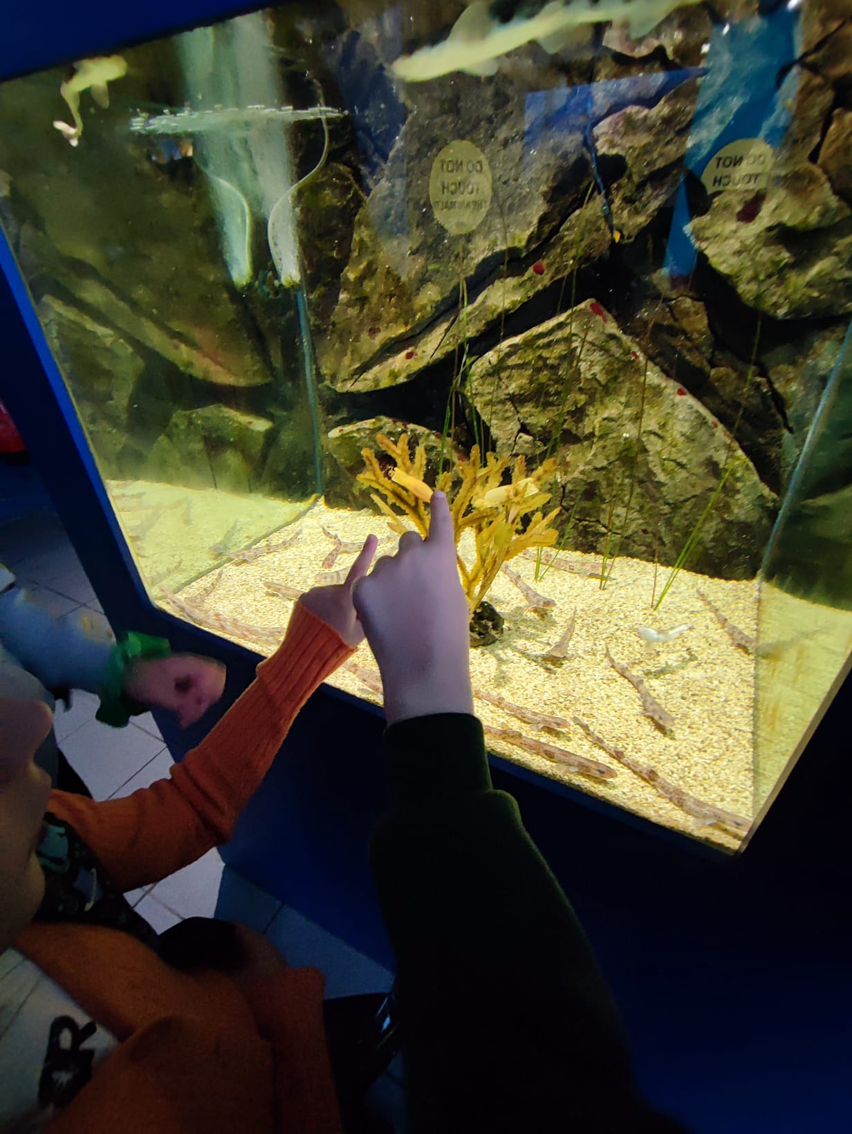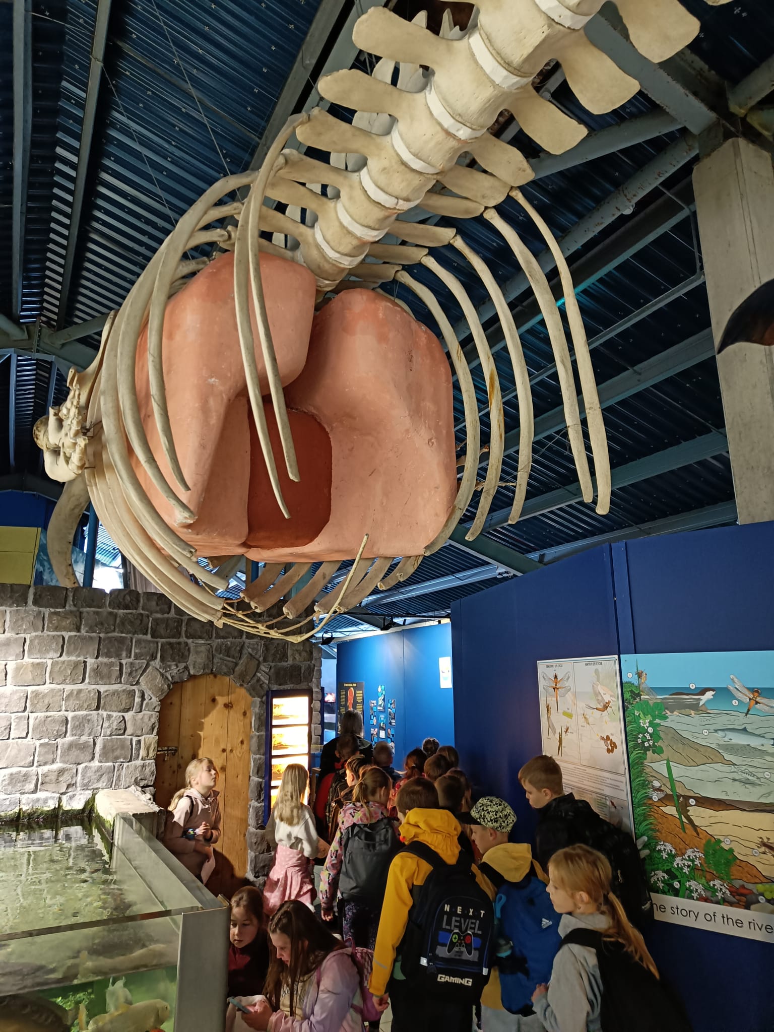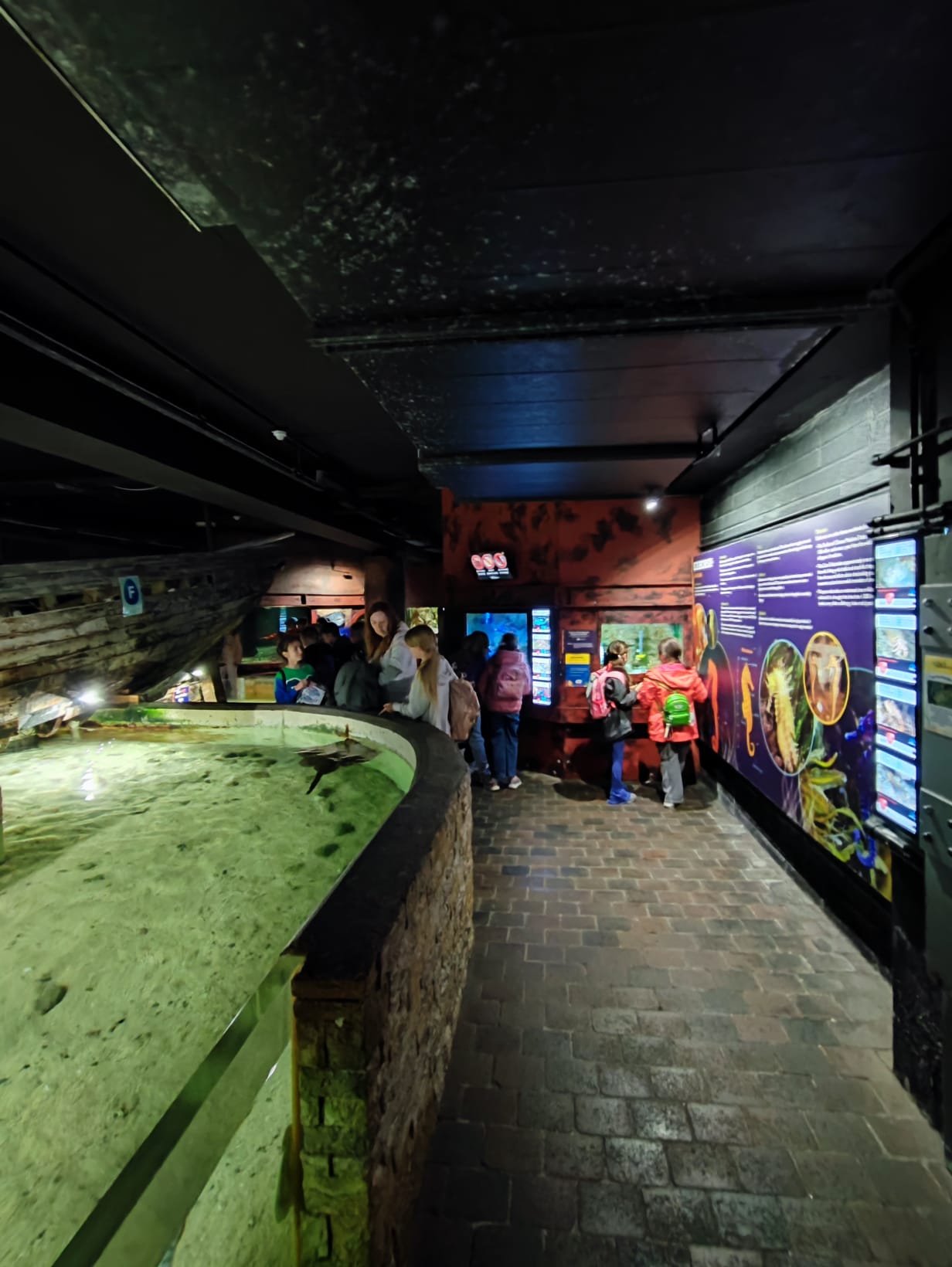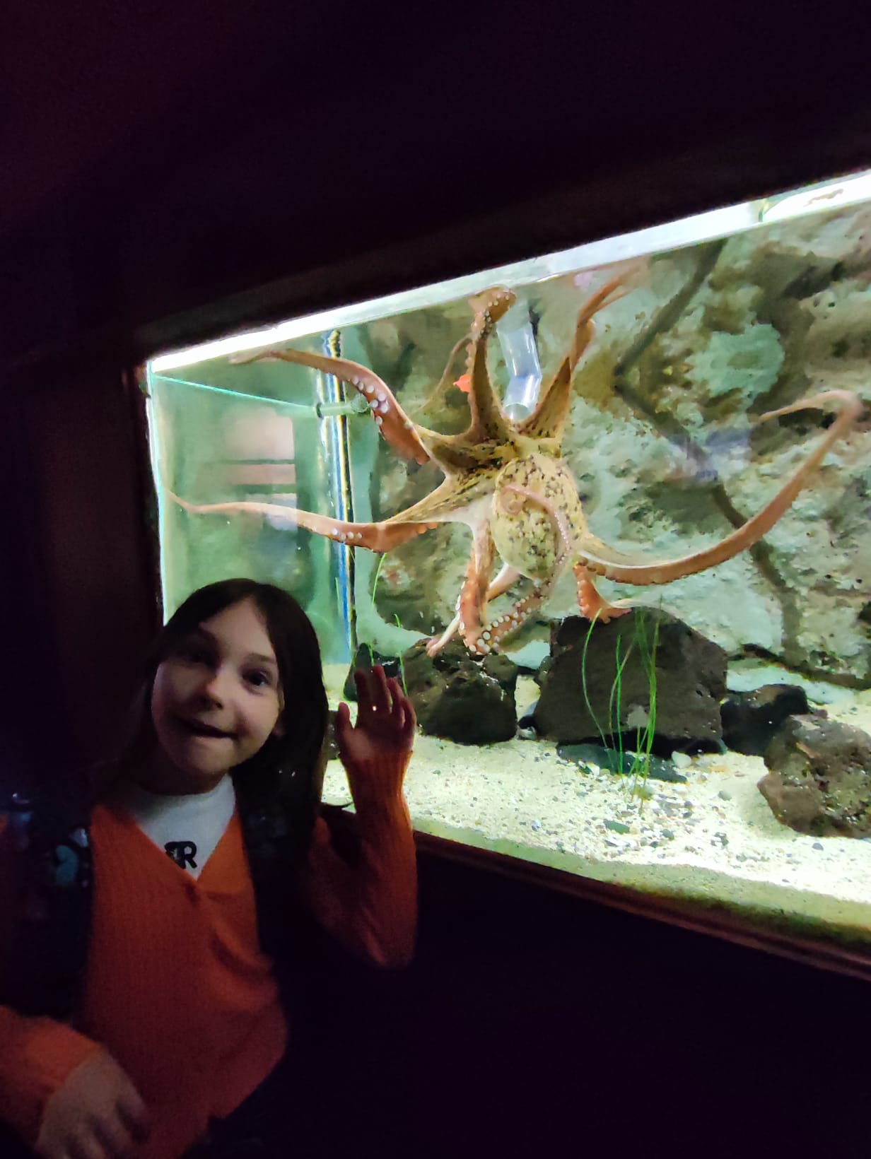 Udało nam się zobaczyć płaszczki, piranie, kolorowe rybki z rafy koralowej, ukwiały, rozgwiazdy, koniki morskie i wiele, wiele innych wodnych stworzeń. Duże wrażenie zrobiła na dzieciach ośmiornica 🐙, „Przedszkole dla rekinów i płaszczek” (Shark&Skate Nursery) oraz ogrooomny szkielet wieloryba.