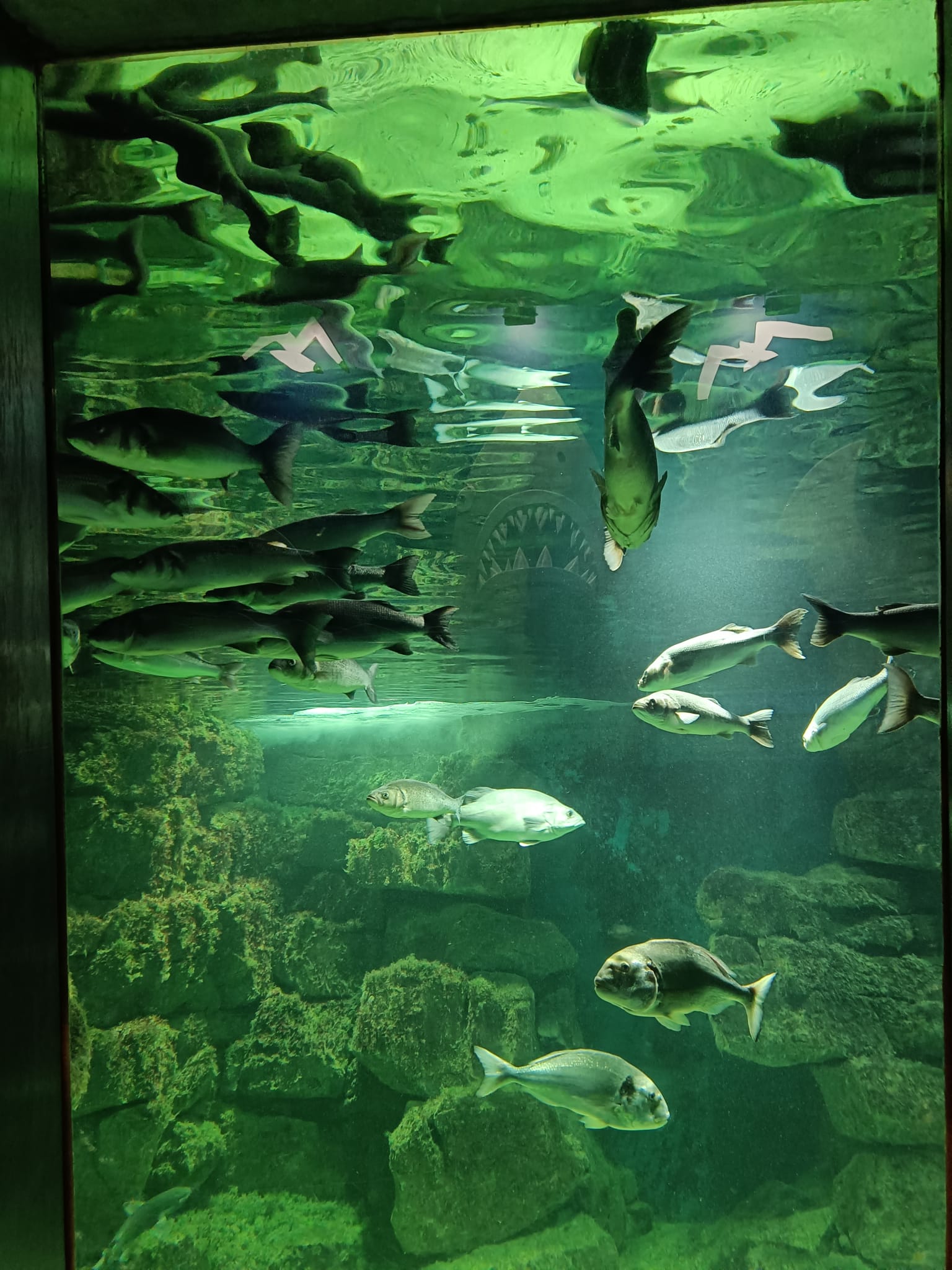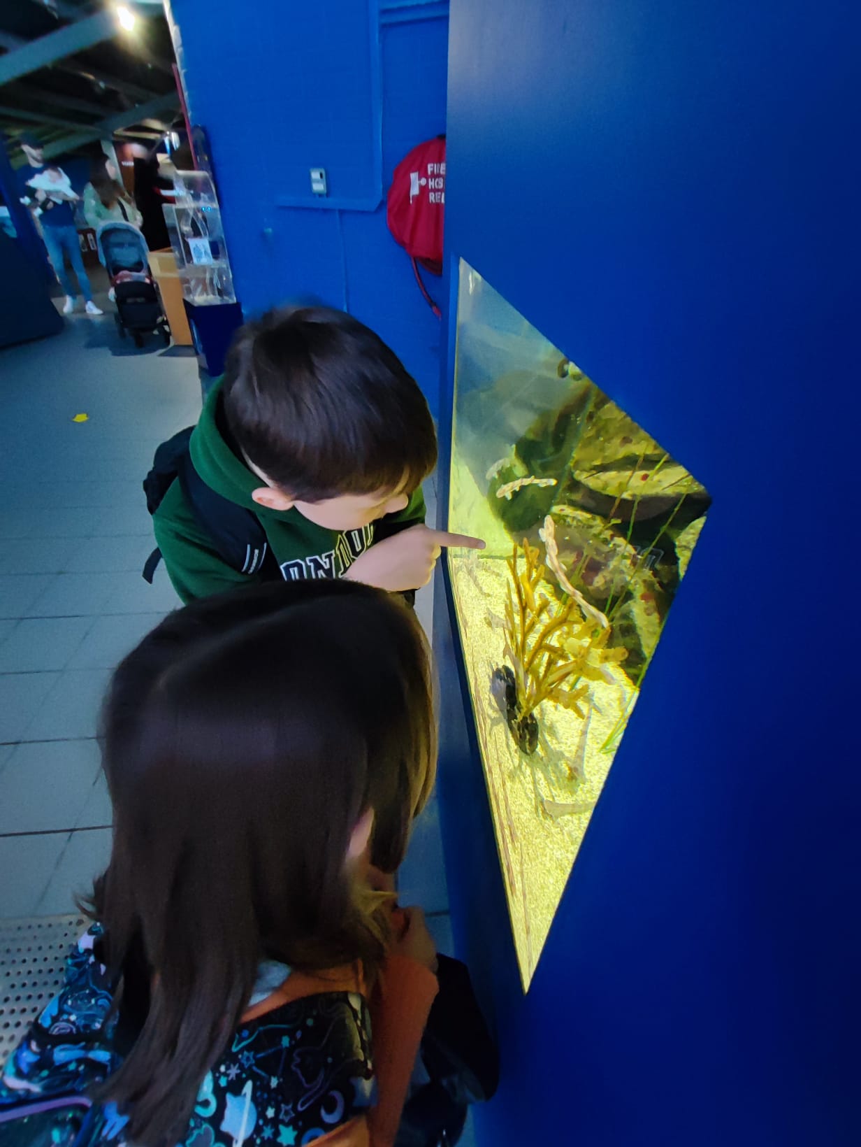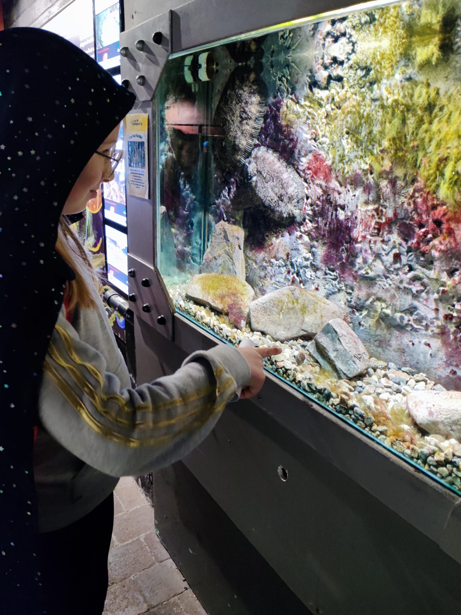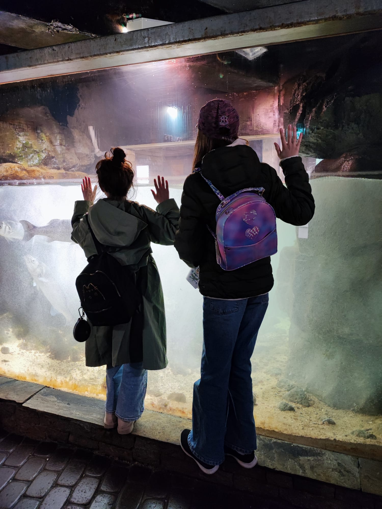 Udało nam się zobaczyć płaszczki, piranie, kolorowe rybki z rafy koralowej, ukwiały, rozgwiazdy, koniki morskie i wiele, wiele innych wodnych stworzeń. Duże wrażenie zrobiła na dzieciach ośmiornica 🐙, „Przedszkole dla rekinów i płaszczek” (Shark&Skate Nursery) oraz ogrooomny szkielet wieloryba.